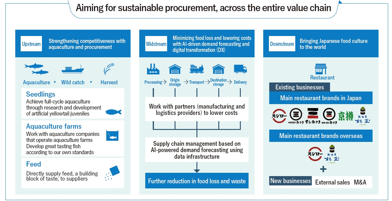 As a business that relies on a large volume of food ingredients, securing a stable supply of limited marine resources is a strategic priority for the Group. We are strengthening a range of initiatives, including establishing a competitive advantage in procurement—encompassing aquaculture—and thoroughly reducing food loss across the resources we procure. Leveraging our strong customer base, we collaborate with external partners to promote the stable and sustainable use of marine and agricultural resources across the entire supply chain.