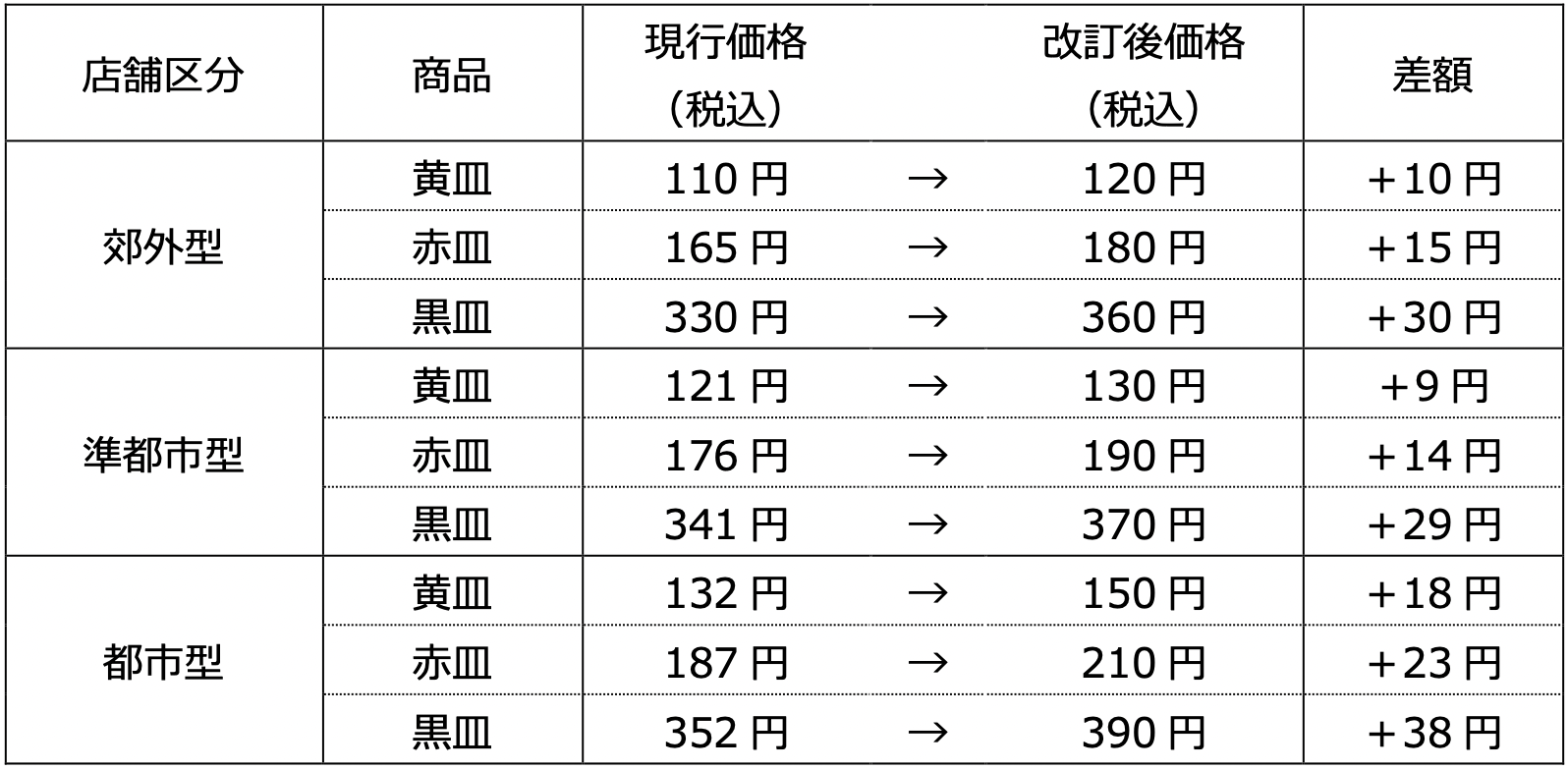 Sushiro is committed to continuing to provide our customers with “delicious sushi to fill your stomach. Delicious sushi to fill your heart.” In light of the current situation, we will revise our prices and reclassify our stores according to the store environment as follows, in order to continue providing Sushiro’s “It’s so delicious, and at this price!” experience that has been supported by our customers, without changing our mission since our founding, such as our commitment to flavor and quality. Thank you for your understanding.