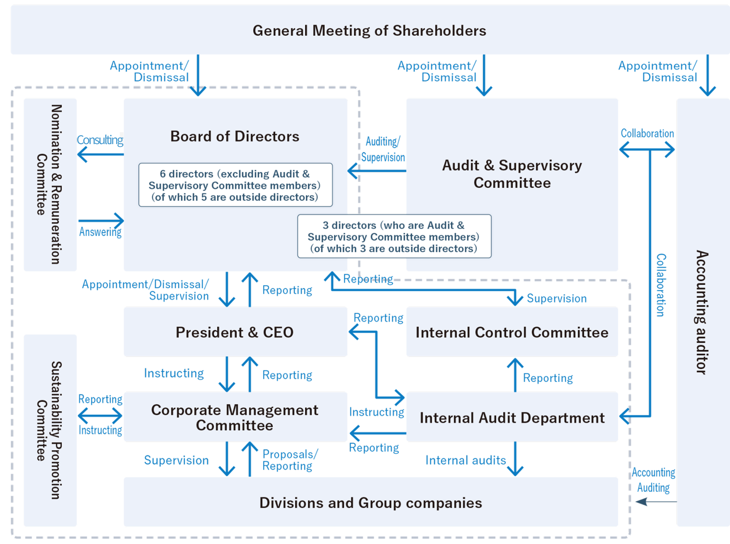 The F&LC Group has clearly positioned sustainability as a Groupwide management issue, and has established the Sustainability Promotion Committee, chaired by the President & CEO, to drive the implementation of sustainability initiatives. The Sustainability Promotion Committee reports as needed to the Corporate Management Committee on the status of sustainability efforts including action on climate change, and receives instructions and advice. In addition, as needed the President & CEO reports on these conditions to the Board of Directors as appropriate.