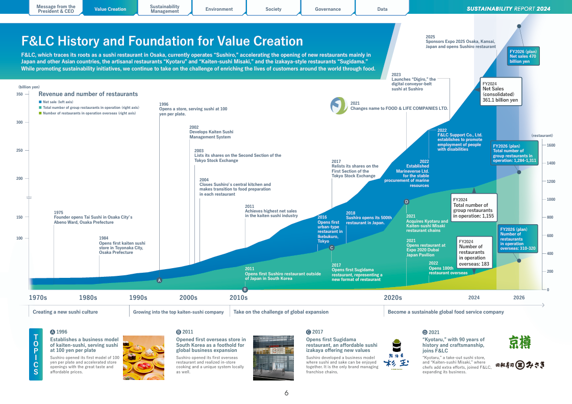 F&LC, which has its roots in a sushi restaurant that originated in Osaka, is accelerating its expansion in Japan and other parts of Asia with its chains of restaurants including “Sushiro,” “Kyotaru” and “Conveyor belt sushi Misaki,” which showcase the skills of their artisans, and “Izakaya” restaurants.