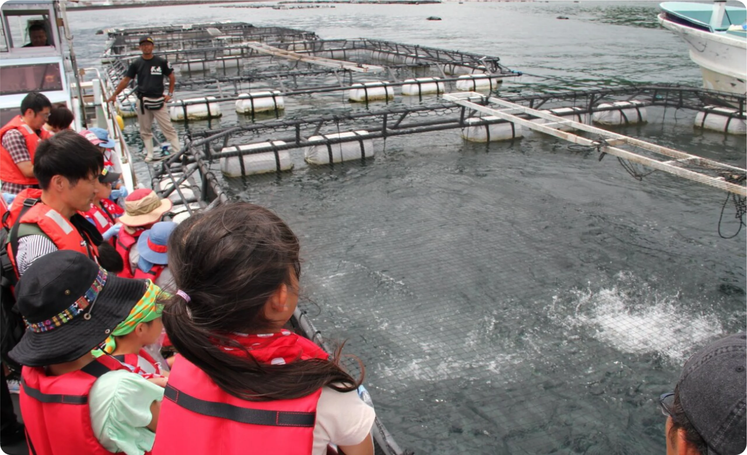 船で養殖場を訪れ、ハマチの餌やり体験や天然魚との比較を行う水産体験イベントです。魚の命に直接触れることで感謝の心を育むほか、すし作り体験や座学を通じて持続可能な水産資源の重要性についても学びました。