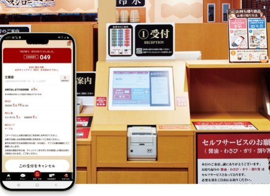 「スシロー」の店舗では、アプリでの来店予約、入店時の案内・発券などの自動案内システム、注文用のタッチパネルやセルフレジ、テイクアウト用の自動土産ロッカーなど、さまざまなデジタル技術を導入しています。DXの活用によって店舗運営を効率化するとともに、待ち時間の短縮や商品の快適な注文、スムーズな商品提供など、お客さまの体験価値の向上を進めています。